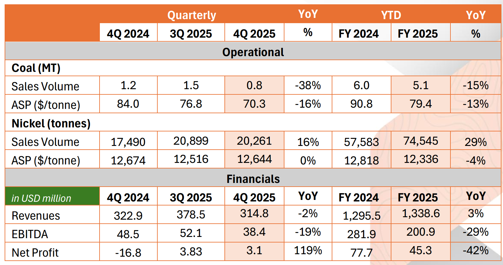 FY2025 EBITDA reached USD 200.9 million declining to 29% YoY for the full year, due to margin compression driven by weaker commodity prices and the changing business mix. As coal historically carried higher margins, the shift toward nickel temporarily pressures profitability during the transition phase